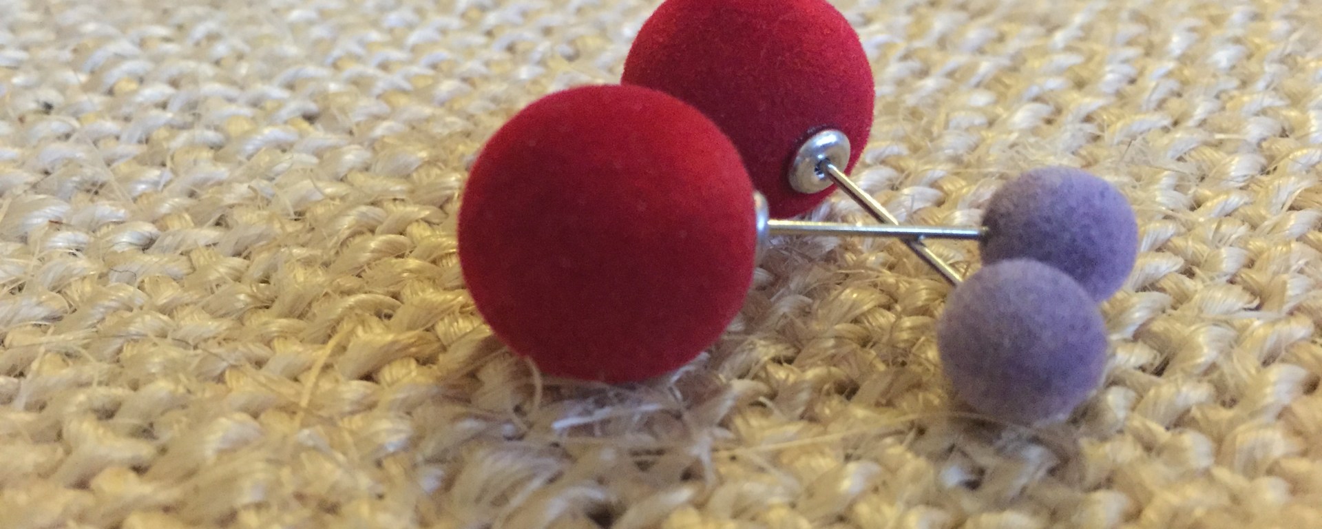 Ik heb die gevonden voor 7 euro in Mango in Parijs, het warenhuis Quatre Temps. Deze oorbellen bestaan uit 4 velvetparels in een non-standaard kleurcombinatie. Een felle, levendige kleur rood met een lavendel paars, dit is echt een leuk contrast. Trouwens, is deze Rood ook een modetrend van het volgende seizoen.